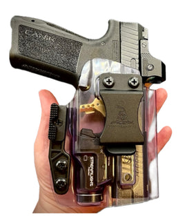 Fits in dedicated Align Tactical Series models including Werkz BISECT IWB Holster and Black Scorpion Gear models. Build selection (Menu Options) from TACRIG, Carey Concealment (Mach1, Mach2, Rotor, and Squadron Pro), Greyman Solutions, Red Hill Tactical, SOUSA Tactical, and Black-Rhino Concealment. Fits existing IWB holsters with the Raven Concealment Systems Vanguard 2 trigger guard, Blackhawk Tecgrip IWB, Sticky Holsters, Crossbreed SuperTuck and leather-backed options. Custom holsters from Lytton Custom Holsters, and self-customizable Blackhawk Formlok Moldable Holster. Add "Align Tactical Thumb Rest" to NOTES section for Red River Tactical. CHECK BACK FOR NEW HOLSTER OPTIONS IN THE WORKS